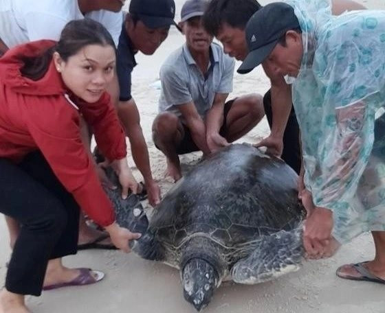 Trong lúc đang vá lưới tại bãi biển thôn Tân Mạch (xã Vĩnh Thái, huyện Vĩnh Linh, tỉnh Quảng Trị), ngư dân phát hiện một cá thể vích có kích