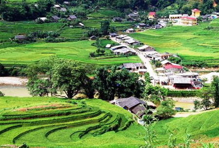 Khách Tây thì không, họ toàn trecking, dắt theo cả trẻ em hoặc địu trên vai, theo các người bản địa dẫn đường vào tận bản, lội hẳn xuống ruộng xem cách dẫn nước bằng ống bương, bón phân, làm cỏ lúa.Nhìn từ trên cao, thung lũng Mường Hoa như chiếc quạt xanh khổng lồ bởi những sóng lúa bậc thang lan tỏa từ con suối chảy vắt qua lên đến lưng chừng núi Hoàng Liên mờ xanh. Những mái nhà sàn thấp thoáng giữa sóng lúa mênh mang.Dưới đây là một số hình ảnh Sa Pa - mùa ruộng bậc thang xanh:
